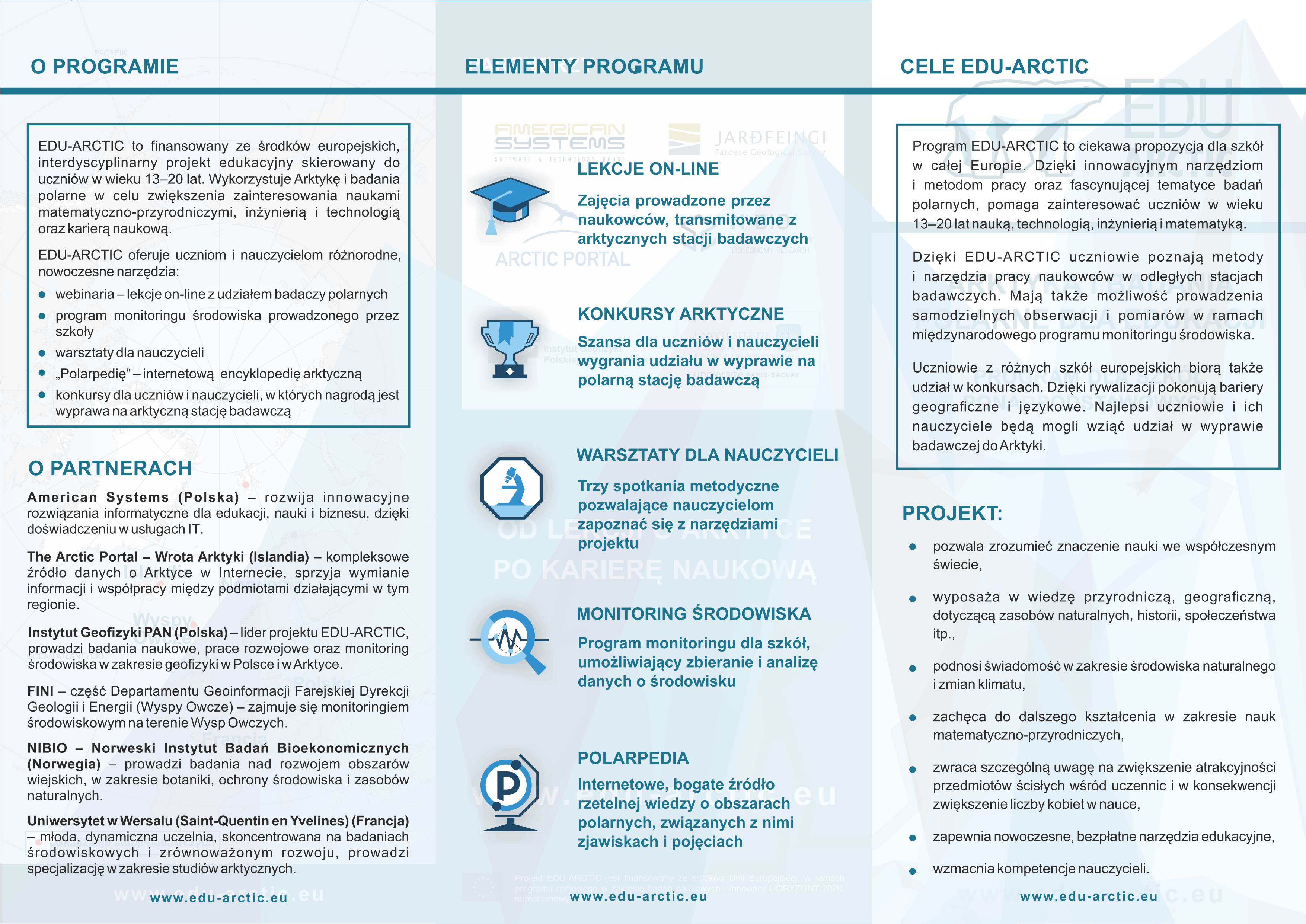 EduArctic Broszura informacyjna - do pobrania Międzynarodowe Forum Edukatorów projektu Edu-Arctic Wyprawa na Islandię Pokonaliśmy 40 szkół z Europy – jedziemy na wyprawę badawczą na Islandię lub Wyspy Owcze Jesteśmy w finale! Co słychać w projekcie Edu-Arctic? Noc w szkole pod hasłem „Arktyczne pożegnanie zimy" Projekt EduArctic - jesteśmy pierwsi w europejskiej rywalizacji Projekt EduArctic - nadal jesteśmy w europejskiej czołówce Projekt EduArctic - nadal jesteśmy w ścisłej czołówce Bierzemy udział w Europejskim projekcie Edu-Arctic Załączniki broszura_edu1.png [526.01 kB] broszura_edu2.png [1.01 MB] Zobacz również EduArctic Lekcje muzealne Lepsza szkoła Mistrzowie Kodowania #SuperKoderzy Weź książkę i czytaj Wychowanie przez teatr
