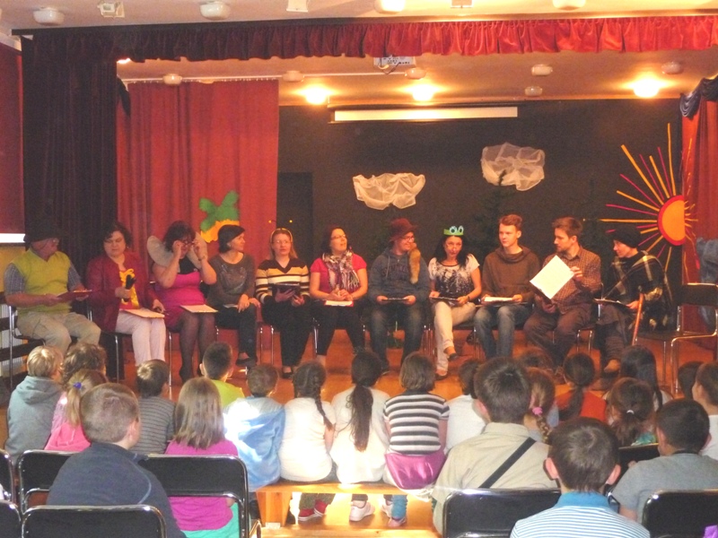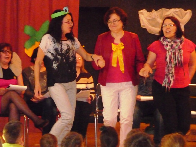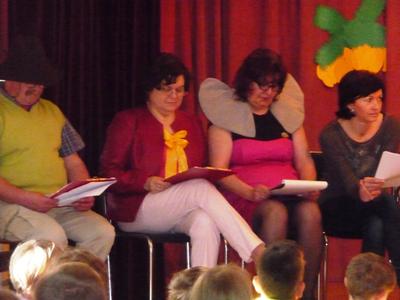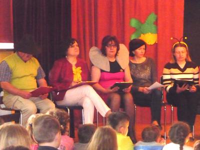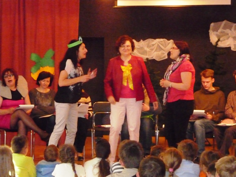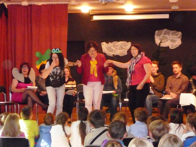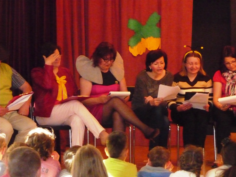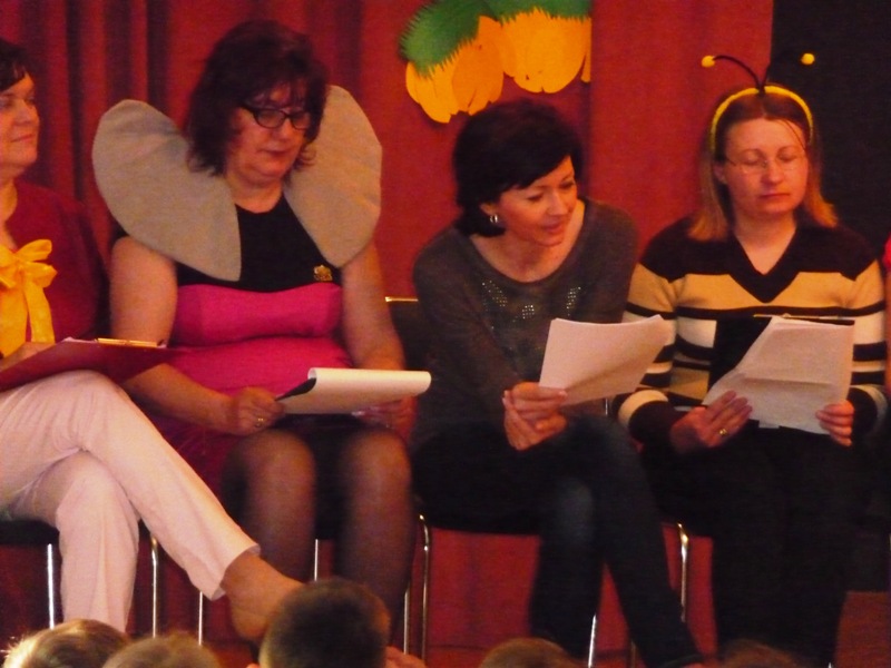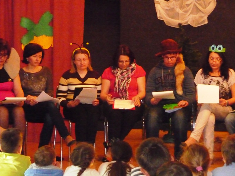 Gosia: Dzisiaj, w naszej szkole, występowali dorośli: pan Geniu był żółwiem, pani dyrektor kaczką, druga pani dyrektor była słoniem, pani Renata była żabką, a pani Lidka ziębą. Zięba ciągle marudziła. Tata Michała był leśnym skrzatem. Był niesamowity, zmieniał głos. Bardzo ładnie czytał.