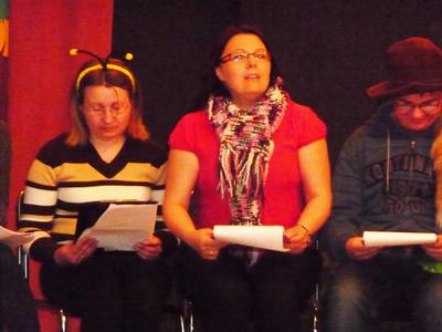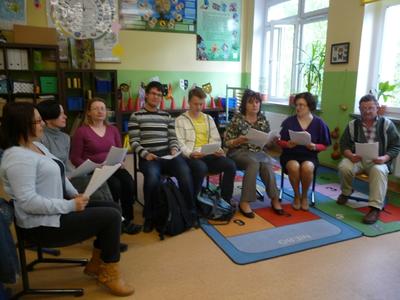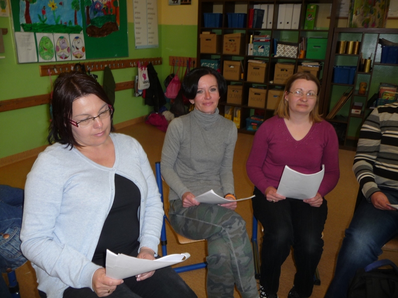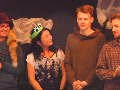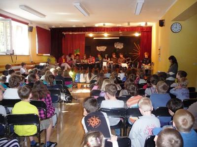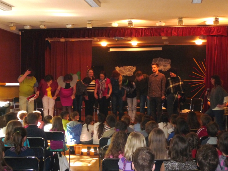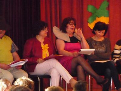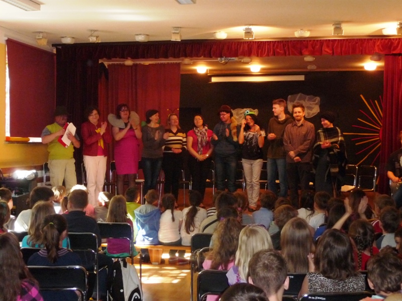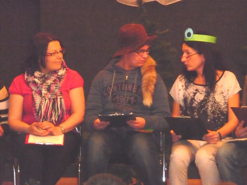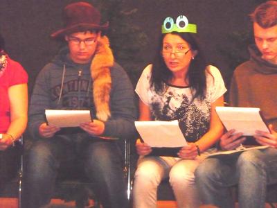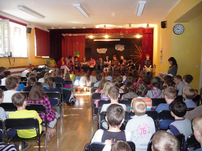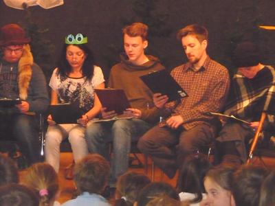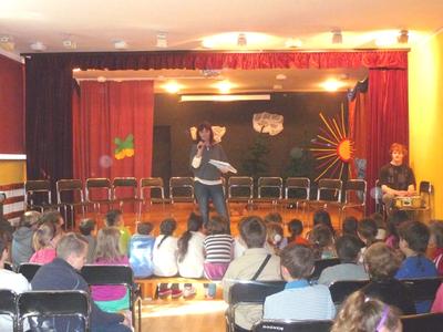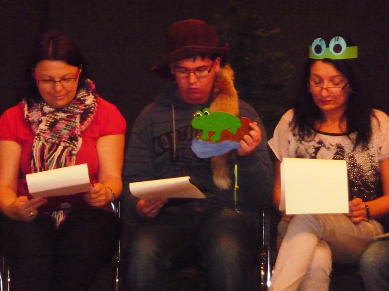 Gosia: Dzisiaj, w naszej szkole, występowali dorośli: pan Geniu był żółwiem, pani dyrektor kaczką, druga pani dyrektor była słoniem, pani Renata była żabką, a pani Lidka ziębą. Zięba ciągle marudziła. Tata Michała był leśnym skrzatem. Był niesamowity, zmieniał głos. Bardzo ładnie czytał.