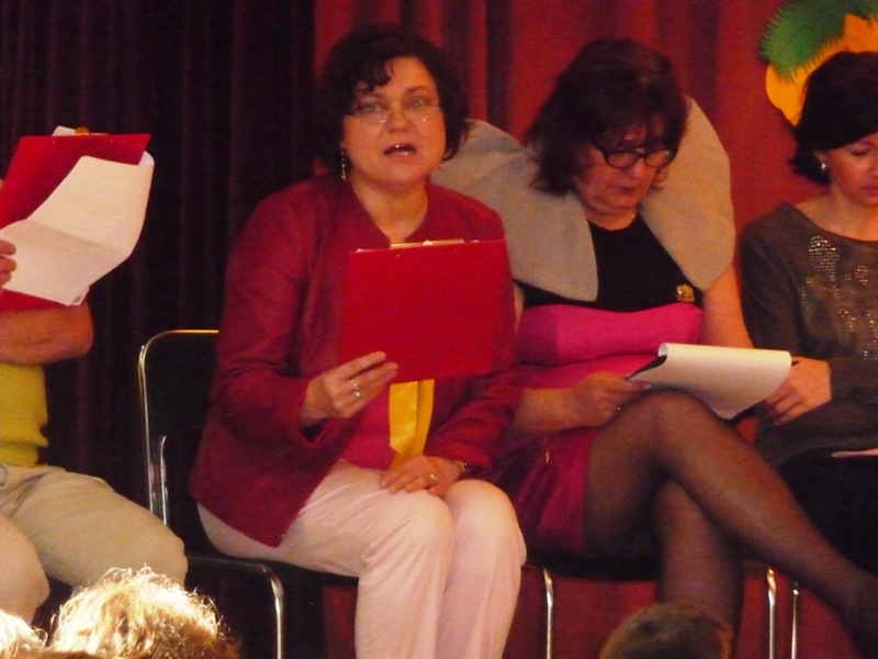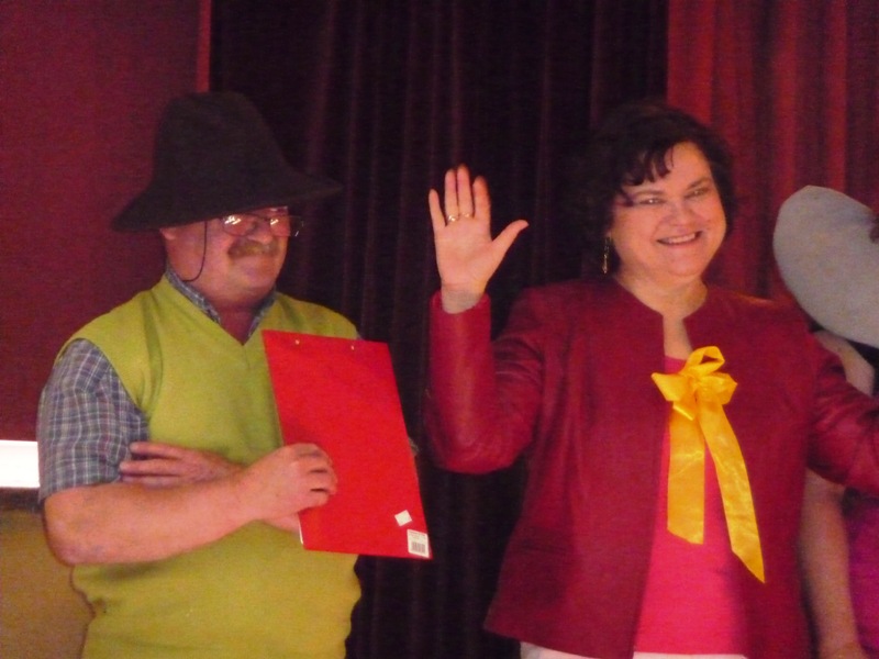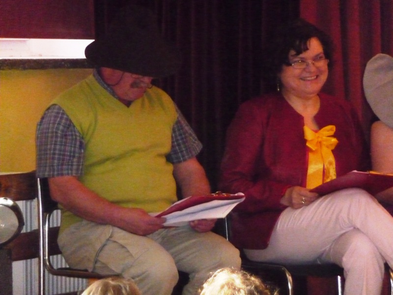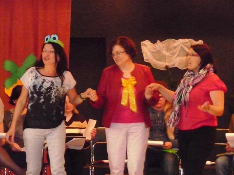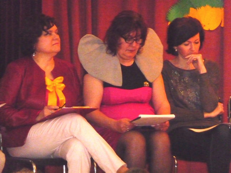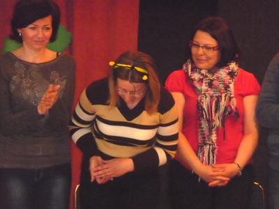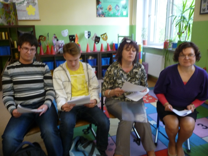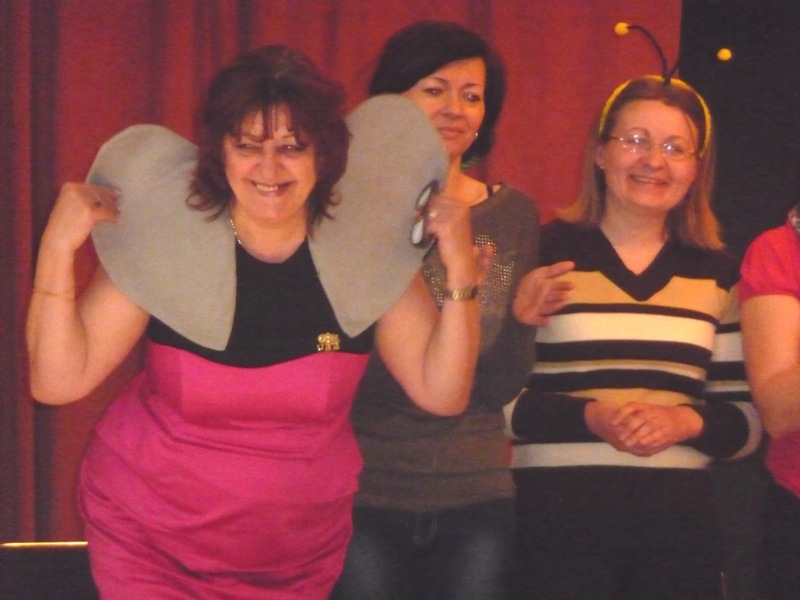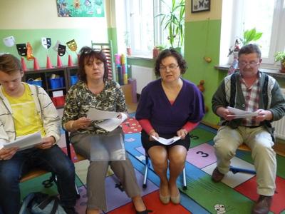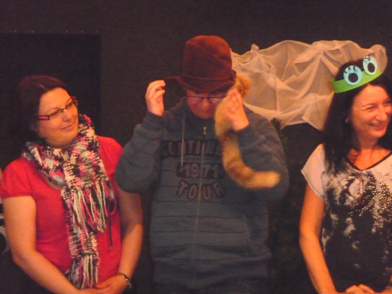 Marysia: Dzisiaj rano bardzo się zdziwiłam. Pan Geniu miał piękny kapelusz na głowie, pani Danusia uszy słonia, pani Lidka kolorowy szal, a pani Renata opaskę na oczach. Pięknie czytali naszą sztukę.