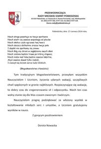 Życzenia Przewodniczącej Rady Miejskiej Gminy Pobiedziska Zdjęcia Zobacz również Zakończenie gimnazjum Wyniki tegorocznego egzaminu gimnazjalnego - mamy... Pierwsze miejsce w Powiatowym Konkursie Informatycznym Życzenia Przewodniczącej Rady Miejskiej Gminy... Uroczystość zakończenia roku szkolnego 2013/2014 Rudawy Janowickie - dzień piewrwszy - Zamek Bolczów... 27 czerwca 2014 Aktualności Wydrukuj Udostępnij Wyświetlono: 528