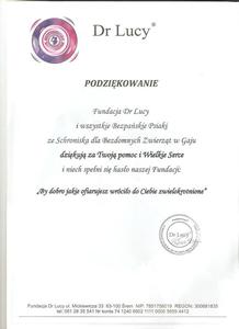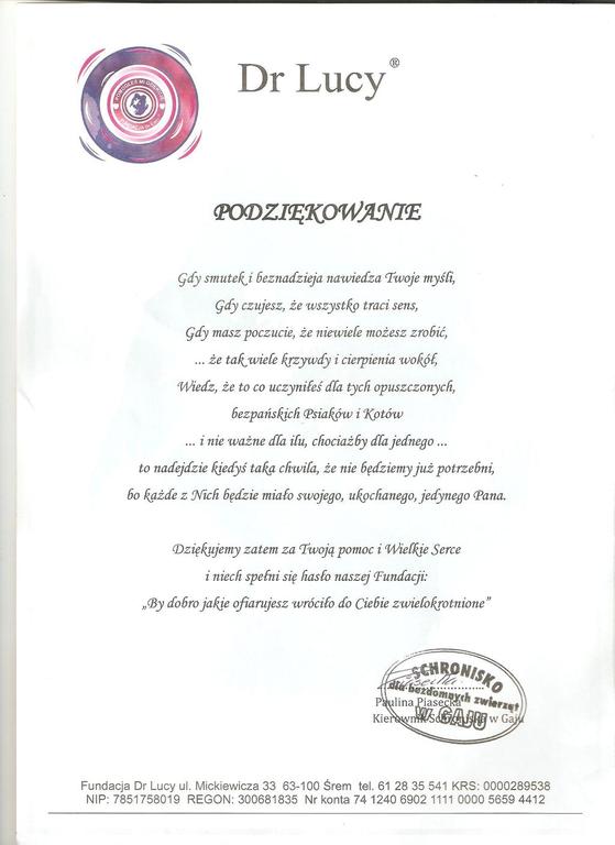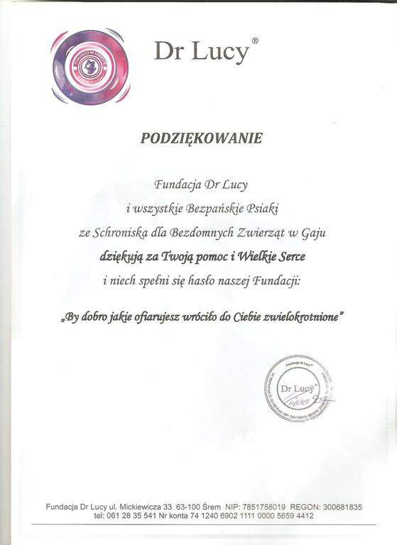 Jak wielkie są serca „małych” ludzi mogliśmy się przekonać w ubiegłym roku szkolnym, kiedy to uczniowie klasy trzeciej szkoły podstawowej podczas dodatkowych zajęć rękodzieła przygotowali oryginalne prace, zorganizowali kiermasz, a za zarobione pieniądze wsparli Fundację Dr Lucy oraz wszystkie Psiaki ze Schroniska w Gaju. Zakupiona została karma, która przekazano do schroniska. Dziś przyszedł czas na podziękowania.