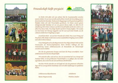 Jesienią tego roku mija 10 lat owocnej współpracy pomiędzy naszymi szkołami. To był wartościowy okres czasu dla rozwoju naszych wzajemnych polsko – niemieckich kontaktów. Dlatego w imieniu całej społeczności szkolnej pragniemy bardzo serdeczne podziękować za stworzenie warunków do nawiązania naszych przyjaźni, bezpośredniego komunikowania się oraz budowania nowych doświadczeń w trakcie wykonywania przyjętych wspólnych zadań. Z serca dziękujemy Dyrekcji szkoły - Panu Dieterowi Schanzer oraz Ewaldowi Kohler i nauczycielom, w szczególności Pani Beacie Nolte, pani birgid budich Panu Frankowi Schaffars za otoczenie nas troskliwą opieką i dostarczenie nam niezapomnianych, pełnych wzruszeń przeżyć podczas pobytu w Waszej szkole oraz w najpiękniejszych miejscach w Marktheidenfeld i w Bawarii. Rodzicom i przyjaciołom szkoły, w szczególności Pani Luci Freitag i Pani Beacie Abb dziękujemy za zapewnienie naszym uczniom i nauczycielom niezwykle serdecznej i rodzinnej gościny w swoich domach. Równie serdecznie dziękujemy Pani Burmistrz Heldze Schmidt-Neder i Przewodniczącemu Komitetu Miast Partnerskich Panu Heribertowi Felbinger za wspieranie naszego partnerstwa w ramach porozumienia miedzy miastami bliźniaczymi.