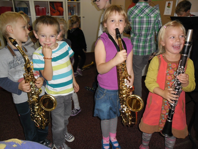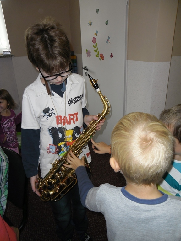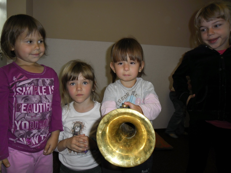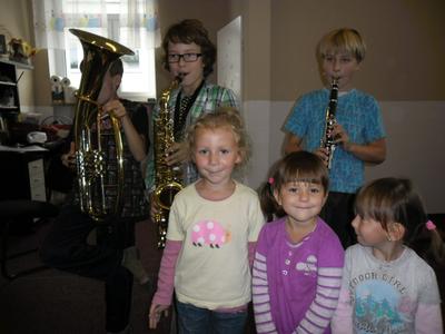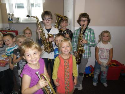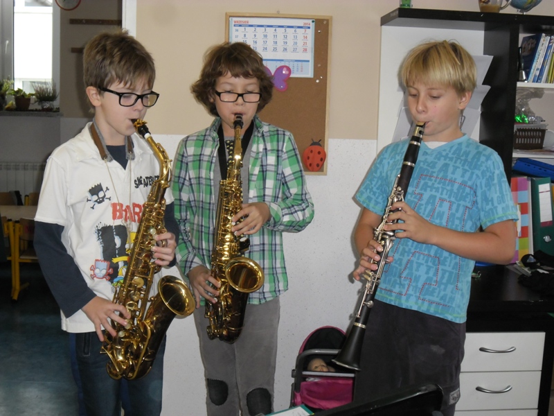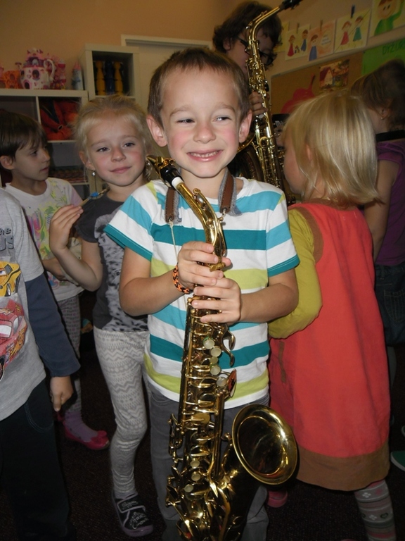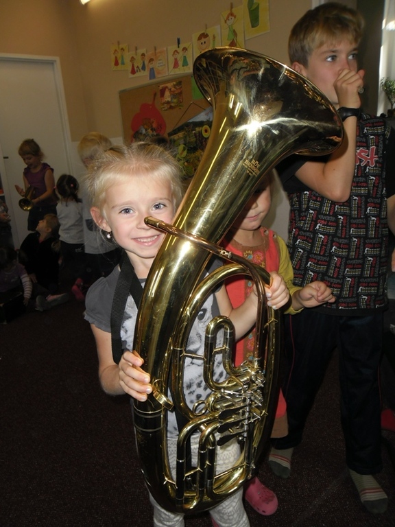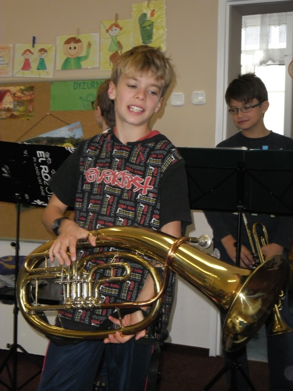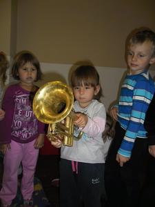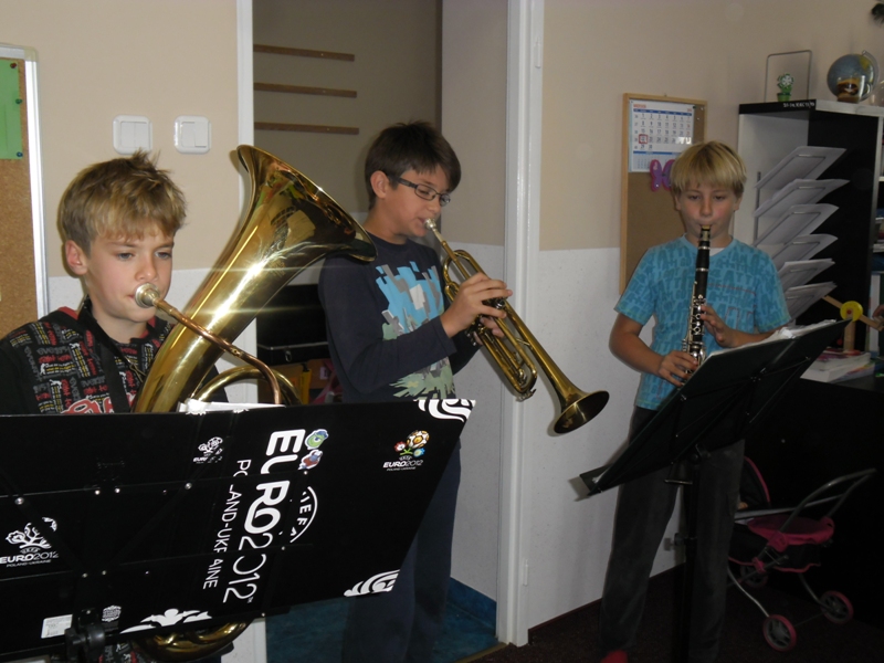 "Nadęta Piątka", czyli mini orkiestra dęta, którą tworzą chłopcy z klasy IV, zawitała niedawno w zerówce. Dzieci szeroko otwierały buzie: ooo!, a okazją do występów była poznawana literka "o", jak "orkiestra". Występ starszych kolegów wzbudził ogromne zainteresowanie, choć niektórzy trochę zasłaniali uszy z powodu głośnych wrażeń muzycznych :) Nadęte Chłopaki, my, Ekoludki, jesteśmy Waszymi fanami!