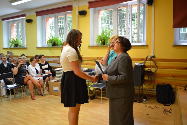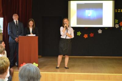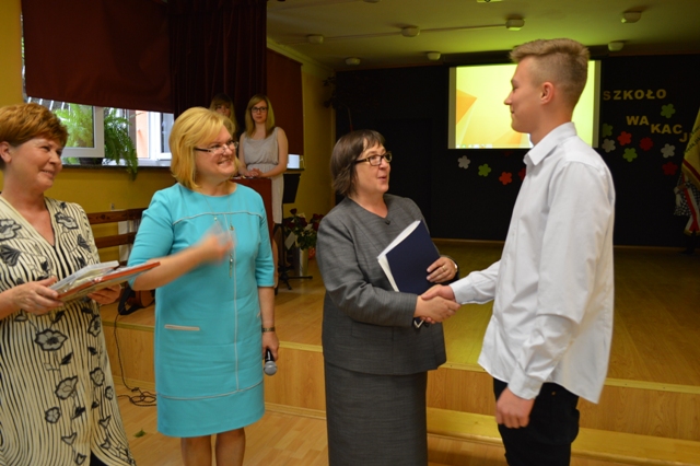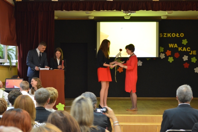 Tak szybko minęły trzy lata intensywnej pracy i młodzieńczego dojrzewania. Szczególne wyrazy uznania należą się oczywiście tym z Was, którzy wykazali się wielką pracowitością, sumiennością, systematycznością i wybili się ponad przeciętność. Osiągnęliście doskonałe wyniki w nauce, braliście udział w rozmaitych konkursach, zdobywaliście zaszczytne miejsca na zawodach sportowych. Gratuluję Wam wyników na egzaminie gimnazjalnym, w szczególności z matematyki – 53,52% ( w woj. wielkopolskim 46,98), języka angielskiego - poziom podstawowy 67,74%, (w woj. wielkopolskim 64,95), języka angielskiego – poziom rozszerzony – 50,91% (w woj. wielkopolskim 46,78), historii i społeczeństwa 63,16% (w woj. wielkopolskim 62,65), języka niemieckiego 86,50% (w woj. wielkopolskim 54,63). Wśród wyników indywidualnych należy wyróżnić jeden wynik 100% z języka angielskiego i jeden wynik 100 % z języka niemieckiego, 5 wyników powyżej 75% z języka polskiego, 6 wyników powyżej 75% z historii i wiedzy o społeczeństwie, 5 wyników powyżej 80% z matematyki, 2 wyniki 86% z przedmiotów przyrodniczych, 8 wyników powyżej 75% z języka angielskiego rozszerzonego. To są wspaniałe wyniki, jesteśmy z Was bardzo dumni. I Wy też możecie być z siebie dumni, bo rzeczywiście daliście z siebie wszystko. Gratuluję Wam licznych sukcesów sportowych, w szczególności dziękuję i gratuluję sukcesów naszym dziewczętom z drużyny hokejowej - Ewie, Martynie, Magdzie, Natalii, Darii i Marysi, które wielokrotnie rozsławiały imię naszej szkoły i gminy Pobiedziska w rozgrywkach na szczeblu wojewódzkim i krajowym ( V m. w Halowych Mistrzostwach Polski w Hokeju na Trawie Juniorek Młodszych w sezonie 2014/2015, II m.w Mistrzostwach Powiatu Poznańskiego w Unihokeju Szkół Gimnazjalnych). Dziękuję za wkład pracy Pani Prezes UKS Jadwidze Błażejewskiej, która z troską opiekowała się naszymi hokeistkami i motywowała ich do wzorowej postawy sportowca. Gratuluję Dominikowi Osowskiemu, Damianowi Stefańskiemu i Oliwii Smolarek ostatniego sukcesu w informatycznym konkursie powiatowym, organizowanym w Jerzykowie, pt. Pomoc dydaktyczna, w którym zajęli I miejsce. Gratuluję Dominikowi Osowskiemu najwyższej średniej w szkole – 5,4 oraz nagrody Burmistrza za wybitne wyniki w nauce.
