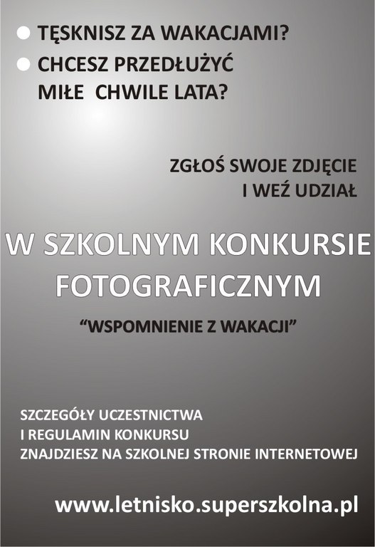 Zapraszamy wszystkich fotografujących uczniów Zespołu Szkół do udziału w konkursie fotograficznym, którego celem jest pokazanie najwspanialszych chwil wakacji. Na zwycięzców czekają nagrody: kupon rabatowy na zakupy w znanym sklepie odzieżowym, nagrody książkowe i upominki (pendrive). Szczegóły uczestnictwa znajdziecie poniżej w regulaminie. Pytania i problemy należy zgłaszać do Aleksandry Lipnickiej (sala 204).