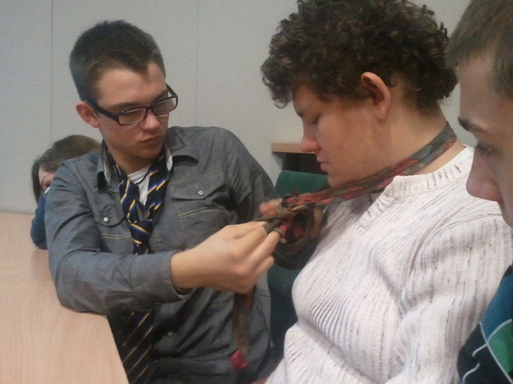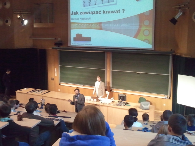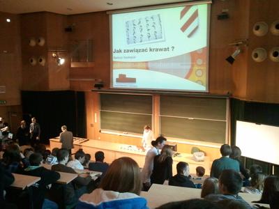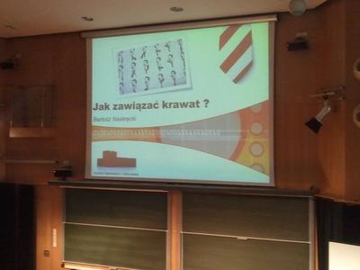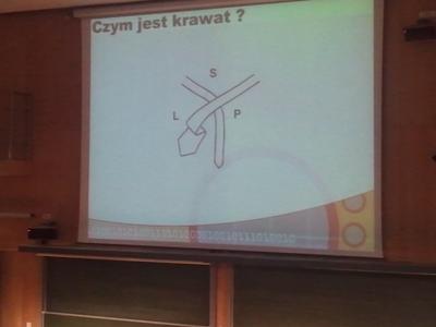 Kierując się tym mottem pan mgr Bartosz Naskręcki pokazał nam, uczniom szkół ponadgimnazjalnych, że wiązanie krawata wcale nie jest bardzo trudnym zajęciem. Poznaliśmy historię węzłów krawatowym m.in. węzła Windsor czy Pratt (używanego przez bohatera szpiegowskich powieści Jamesa Bonda). Dowiedzieliśmy się o metodach wiązania „ozdobnego zwisu męskiego”. No i kto by pomyślał, że krawat można zawiązać aż na 85 różnych sposobów (o tym dowiedział się świat dopiero na przełomie 1999 i 2000r.). Poznaliśmy również skomplikowane funkcje, które pozwalają na obliczenie ilości węzłów krawatowych.