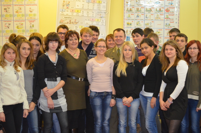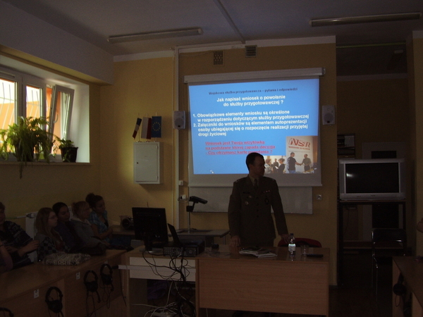 Minęły czasy, kiedy młodzi chłopcy obawiali się poboru do wojska. Dzisiaj służący w armii to zawodowcy, którzy sami wybrali ten sposób na życie. Nowe przepisy równo traktują kobiety i mężczyzn. O tym jak znaleźć pracę w jednostkach polskiego wojska, jak trafić do Narodowych Sił Rezerwy i jakie warunki musi spełnić kandydat, informował nas pan major Sławomir Roman , szef Wydziału Rekrutacji Wojskowej Komendy Uzupełnień w Poznaniu, który gościł w naszej szkole. W spotkaniu uczestniczyli uczniowie trzeciej klasy liceum ogólnokształcącego oraz chętni, zainteresowani profilem mundurowym z klas pierwszej i drugiej. Zajęcia odbyły się w ramach zadań doradztwa zawodowego.