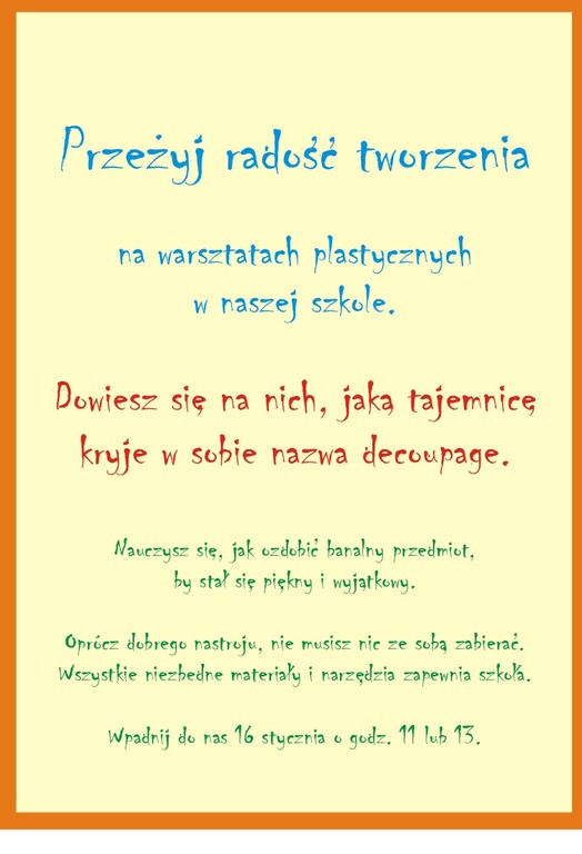 Warsztaty decoupage Zdjęcia Zobacz również Świąteczne paczki „Bezpiecznie na stoku” Skimboarding - prześlizgaj ferie na desce Warsztaty decoupage Warsztaty grafiki komputerowej Drodzy Gimnazjaliści ze szkół Gminy Pobiedziska. 07 stycznia 2013 Aktualności Wydrukuj Udostępnij Wyświetlono: 696