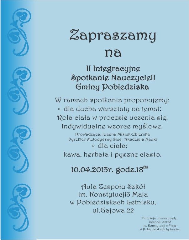 Zaproszenie na II Integracyjne Spotkanie Nauczycieli Gminy Pobiedziska Zdjęcia Zobacz również MY SIĘ ZIMY NIE BOIMY! W ZDROWYM CIELE ZDROWY DUCH! PIERWSZY DZIEŃ WIOSNY „W DRUGIEJ A” Zaproszenie na II Integracyjne Spotkanie Nauczycieli... Zajączkowa niespodzianka K@SSK- IX Konferencja Administratorów Szkolnych... 27 marca 2013 Aktualności Wydrukuj Udostępnij Wyświetlono: 637