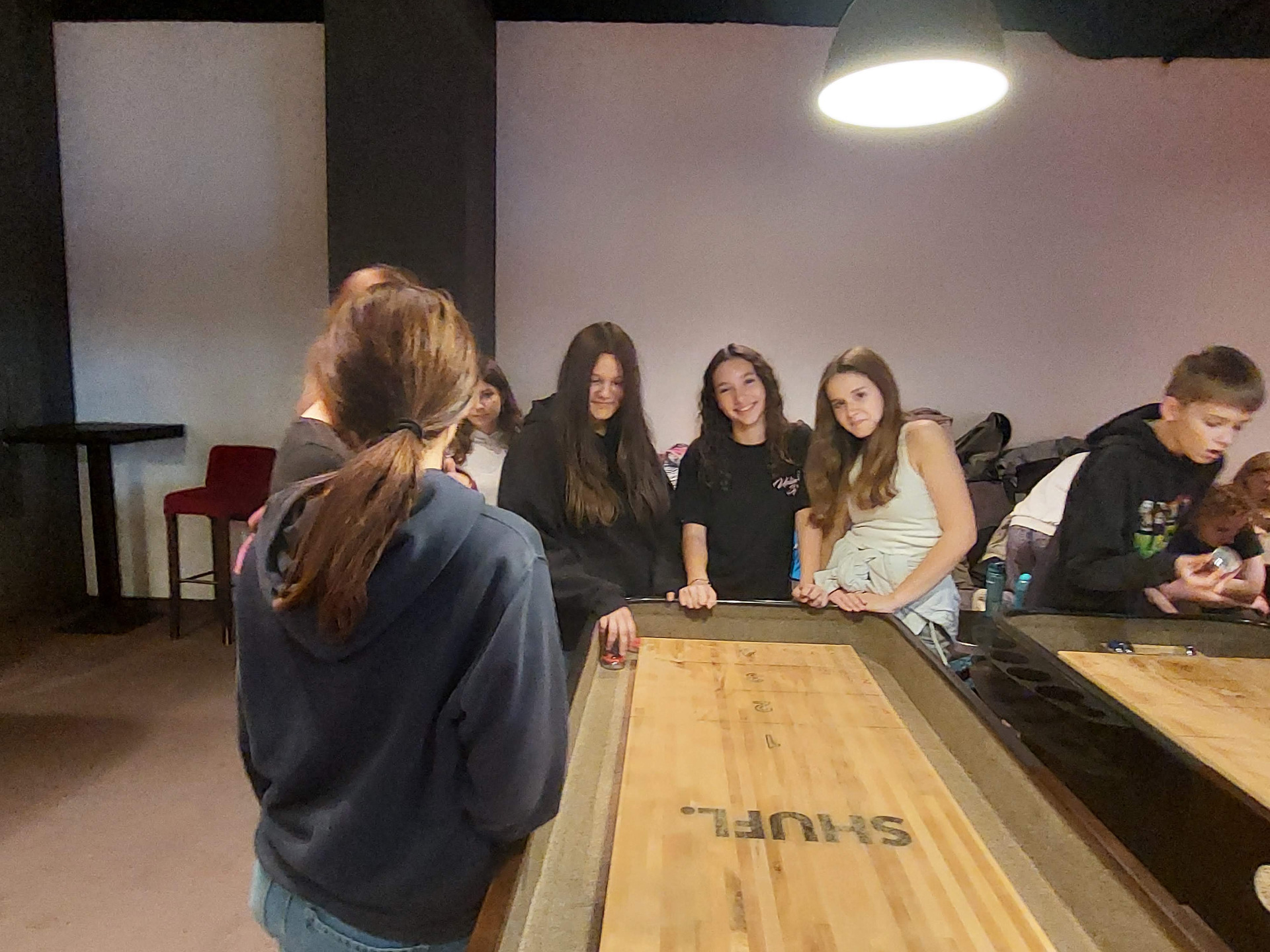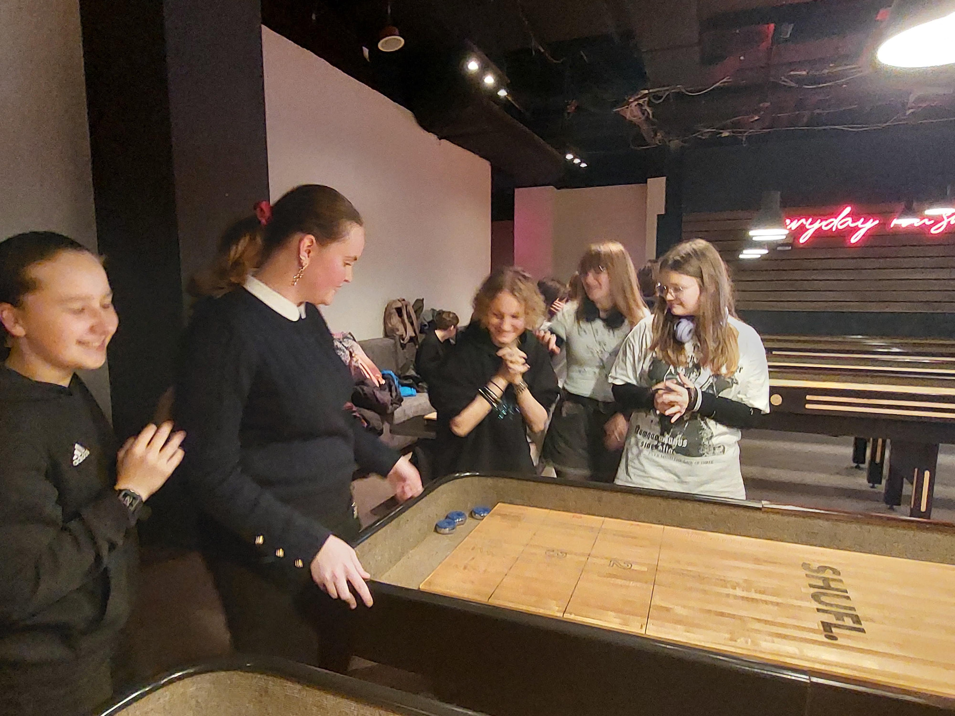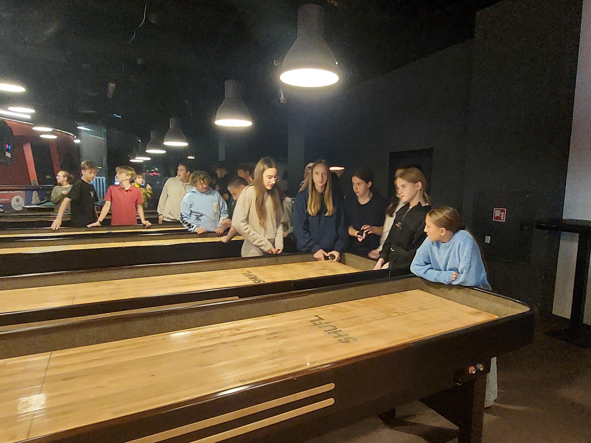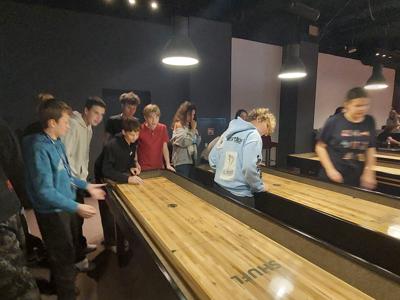 Po części edukacyjnej obie klasy udały się do MK Bowling, gdzie rozegrano drużynową grę w Shuffleboard. Rywalizacja przebiegała w przyjaznej atmosferze, a uczniowie mogli sprawdzić swoje umiejętności w nietypowej i emocjonującej dyscyplinie sportowej. Było dużo śmiechu, zdrowej rywalizacji i dobrej zabawy jak przystało na obchody Dnia Chłopaka😊