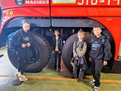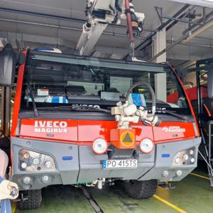 Kolejną atrakcją był przejazd do strażnicy Lotniskowej Służby Ratowniczo-Gaśniczej. Tam uczniowie uczestniczyli w niezwykle interesującej prezentacji przygotowanej przez strażaków, którzy zaprezentowali specjalistyczny sprzęt oraz pojazdy wykorzystywane w akcjach ratowniczych na lotnisku.