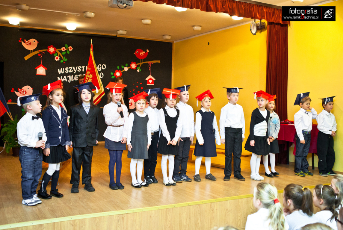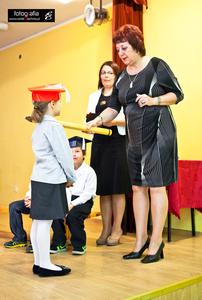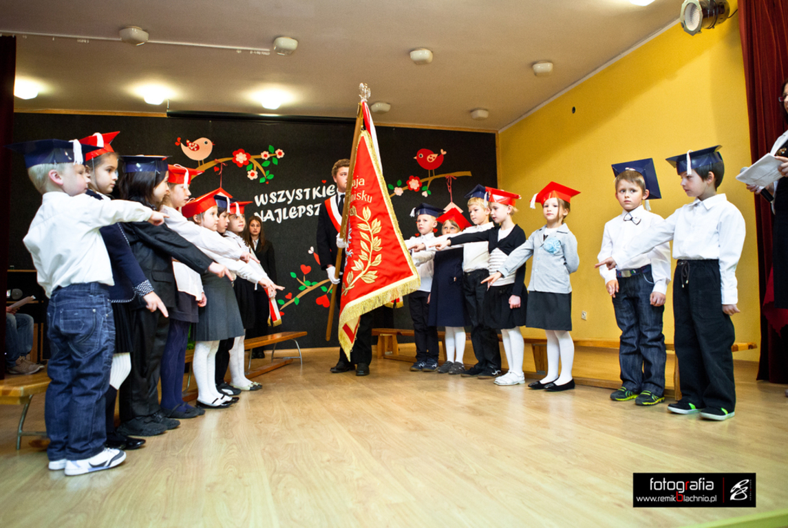 Pani Dyrektor Danuta Larus przyjęła ślubowanie oraz dokonała aktu pasowania na ucznia. Dzieci otrzymały dyplomy oraz szkolne legitymacje. Głos zabrała pani Dyrektor składając życzenia dzieciom oraz ich rodzicom. Zwróciła uwagę na to, iż dzieci są uczniami tej szkoły ale też obywatelami Europy i świata. Mówiła też o ukrytych możliwościach i zdolnościach każdego ucznia. Zachęcała pierwszaków do rozszerzania swych horyzontów myślowych oraz do spełniania marzeń, bo one powodują, że mamy w życiu swoje cele. Radna powiatu pani Małgorzata Halber życzyła dzieciom szkolnych sukcesów oraz zapraszała do biblioteki szkolnej. Pan Jan Lindner Przewodniczący trójki klasowej zachęcał do zdobywania wiedzy a nauczycielom życzył jak najmniej trosk i zmartwień w swej pedagogicznej i wychowawczej pracy z uczniami. Po tak miłych i serdecznych życzeniach pan fotograf Remigiusz Błachnio wykonał pamiątkowe zdjęcia, które wkrótce ukażą się na internetowej stronie szkoły.