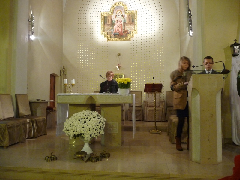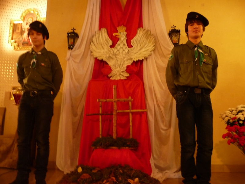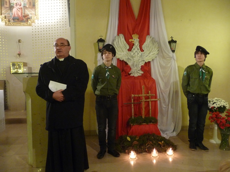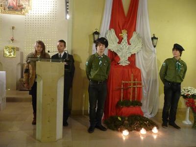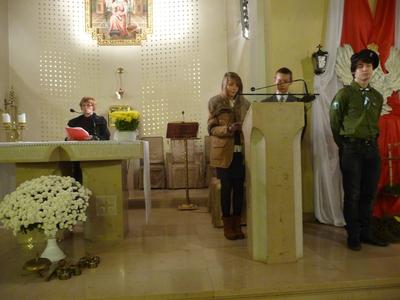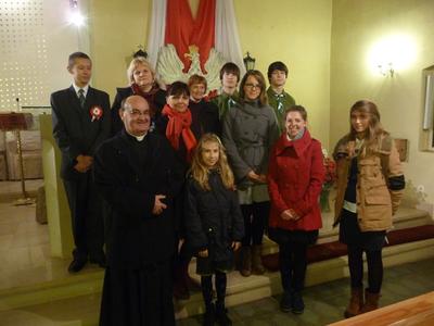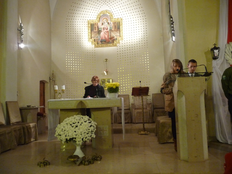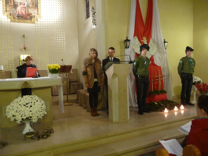 11 listopada- nauczyciele, uczniowie i absolwenci Zespołu Szkół im. Konstytucji 3 Maja w Pobiedziskach Letnisku, pod kierunkiem H. Czajki i A. Olejniczak, przygotowali uroczystość patriotyczną z okazji Święta Niepodległości dla mieszkańców Jerzykowa i Biskupic. Biało-czerwona flaga spływająca po ścianie kościoła, Orzeł Biały, harcerska warta honorowa wprowadziły w podniosły nastrój zebranych ludzi. Podczas tej uroczystości przypomnieliśmy dzieje narodu polskiego od 1918 roku do dnia dzisiejszego. W scenariuszu wykorzystaliśmy wiersze H. Czajki oraz pieśni religijne i patriotyczne. Niejednemu, ze wzruszenia, zakręciła się łza w oku. Na koniec pomodliliśmy się za naszą Ojczyznę i wspólnie odśpiewaliśmy