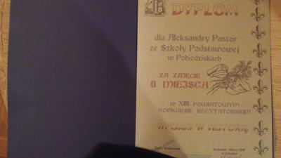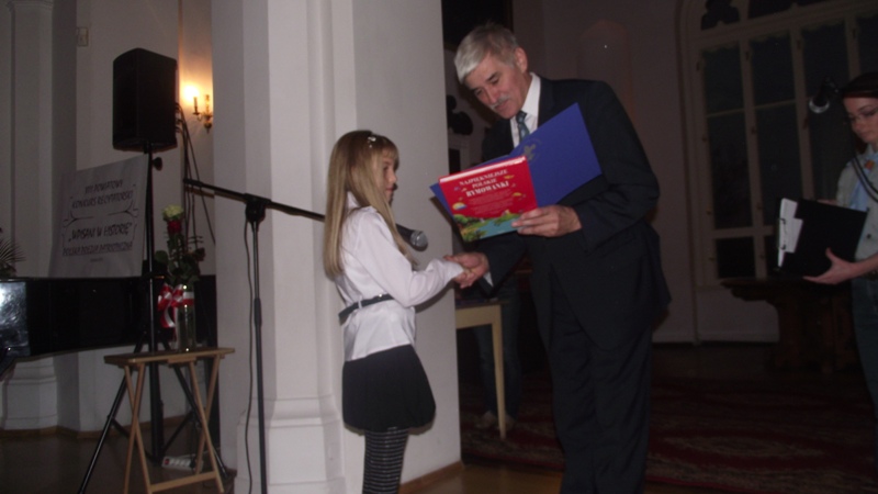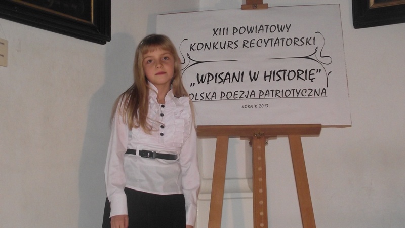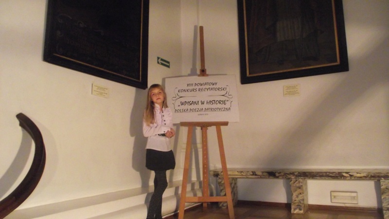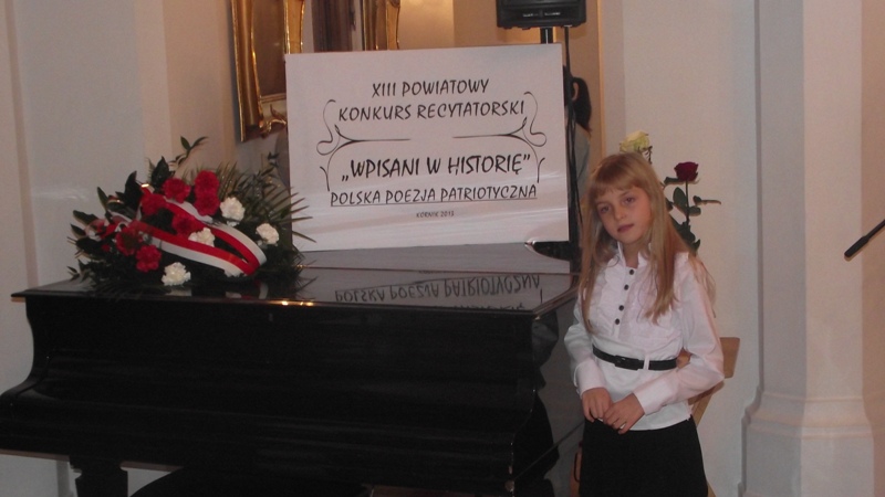 ” Wpisani w historię” – 11 listopada- odebrała nagrodę książkową, podczas obchodów 95 rocznicy odzyskania niepodległości przez Polskę, na Zamku Kórnickim. W obecności władz samorządowych i znamienitych gości Ola recytowała wiersz H. Czajki: „ Polskie krajobrazy”.