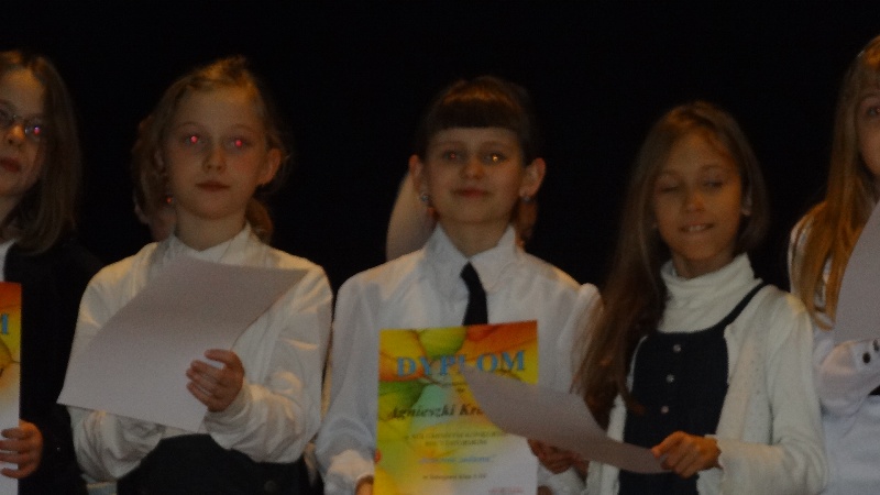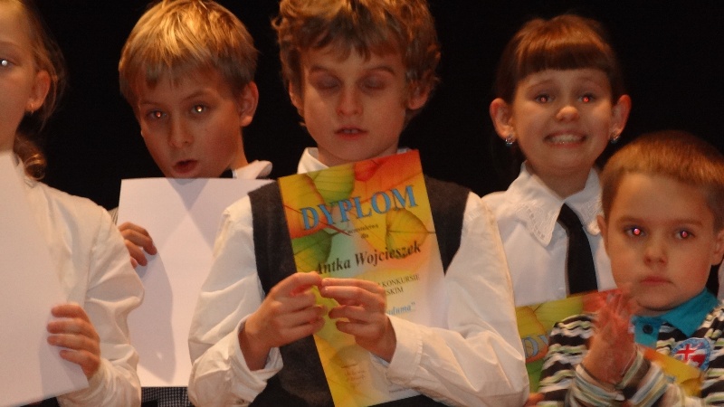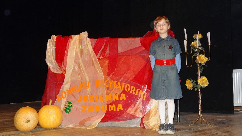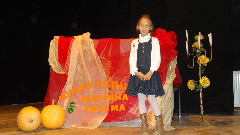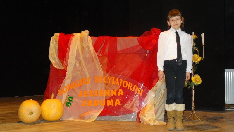 Podczas gminnego konkursu recytatorskiego „Jesienna Zaduma” Agnieszka Krasuska z klasy III A zajęła w swojej kategorii wiekowej I miejsce prezentując wiersz Jacka Cudnego „Pajęczyna”. Gabriela Jędrzejczak z klasy III B natomiast wybrała do konkursu wiersz „Kwoka” Jana Brzechwy, za który została wyróżniona. Naszą szkołę reprezentowały również uczennice Anna Meisner i Aleksandra Pastor z III B oraz Piotr Szymiec z klasy III A. Ich występy były bardzo udane.