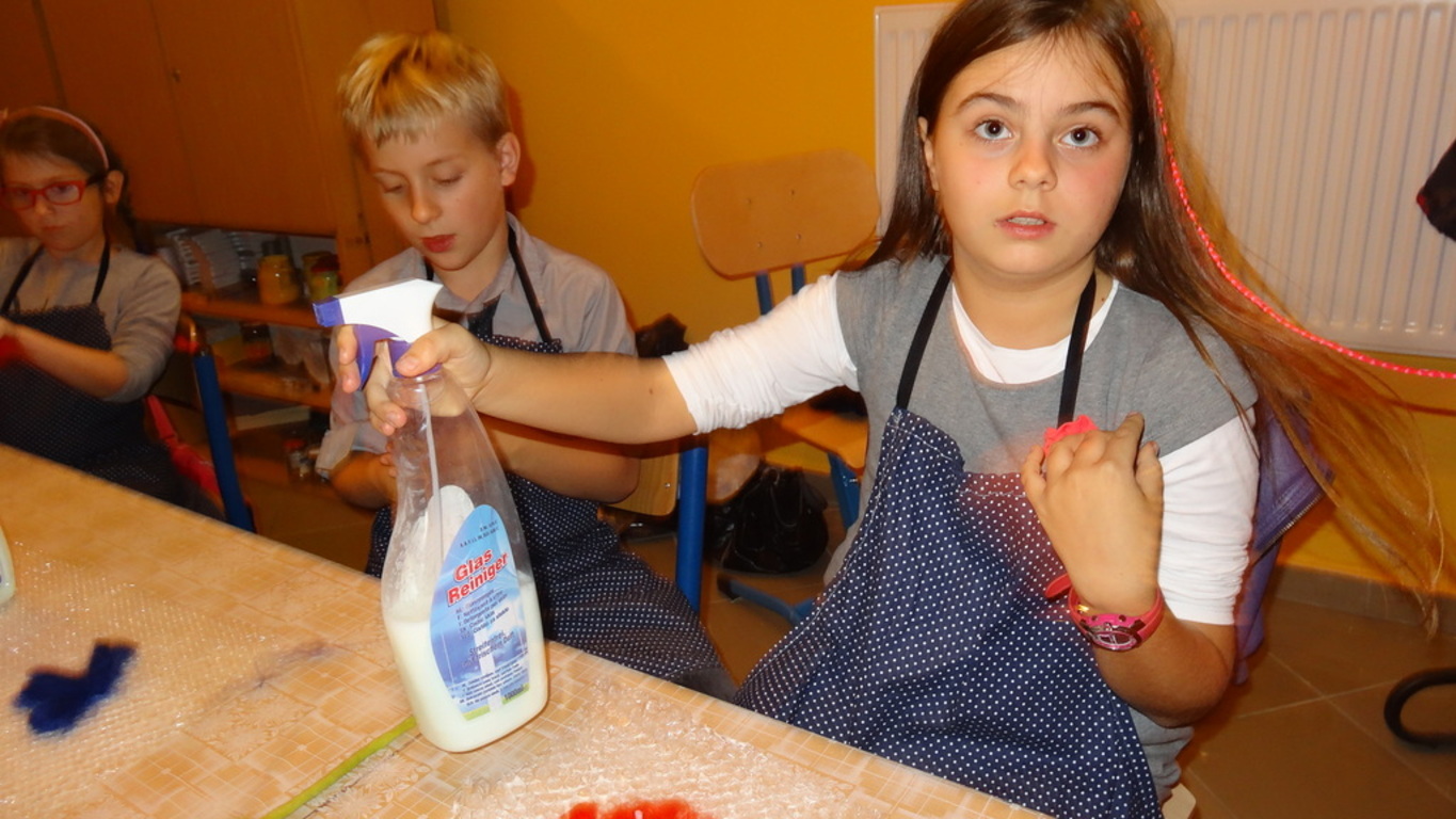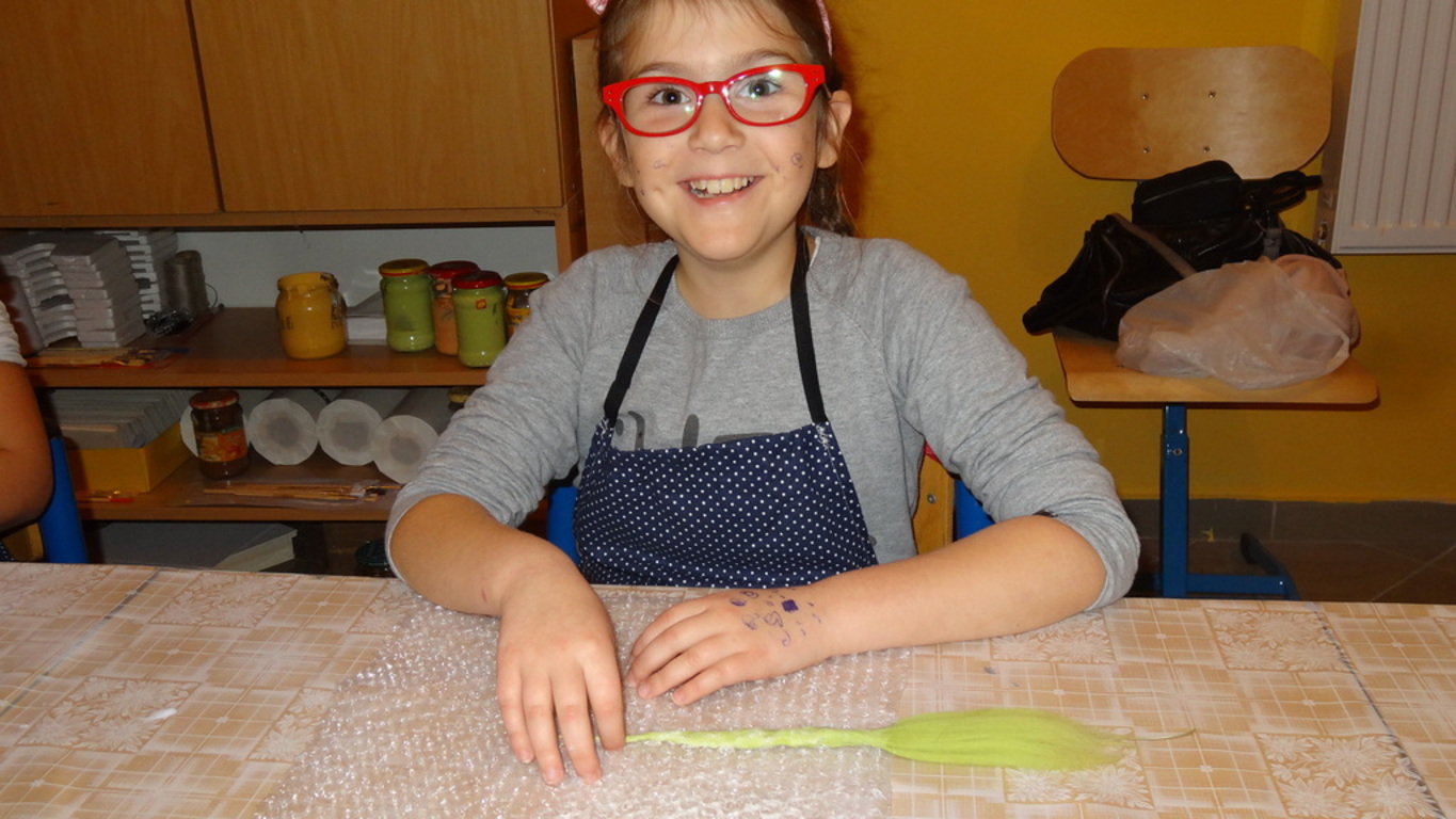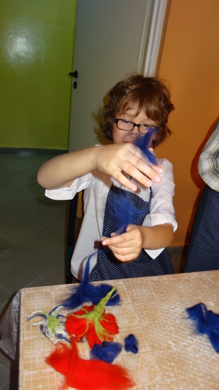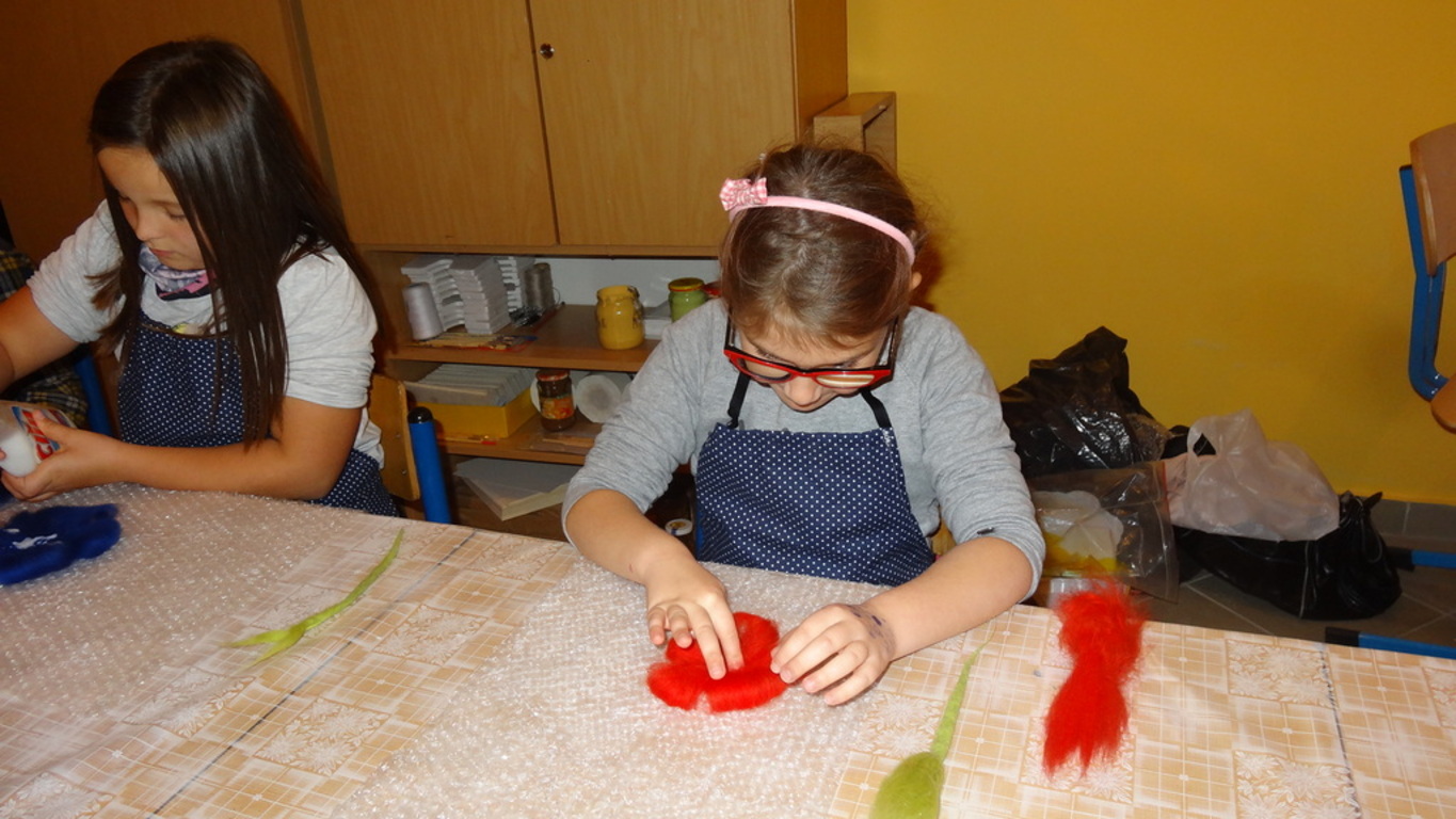 Cotygodniowo 14 par sprawnych rączek uczniów klas III SP spotyka się na zajęciach, by spróbować swych sił, w nowych i oryginalnych technikach plastycznych. Wielkim zainteresowaniem cieszyło się filcowanie. Młodzi artyści z zaangażowaniem podjęli wyzwanie filcowania na sucho i mokro. Miło było patrzeć jak bezkształtna wełna czesankowa zmienia swoją postać stając się ozdobnymi kwiatami.