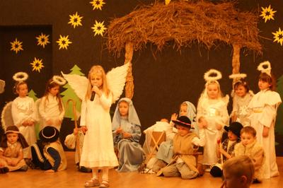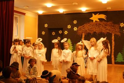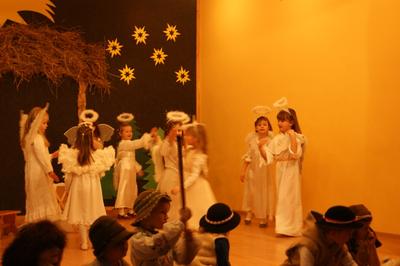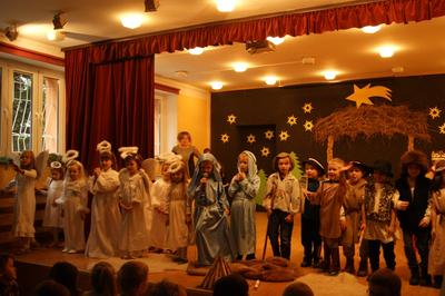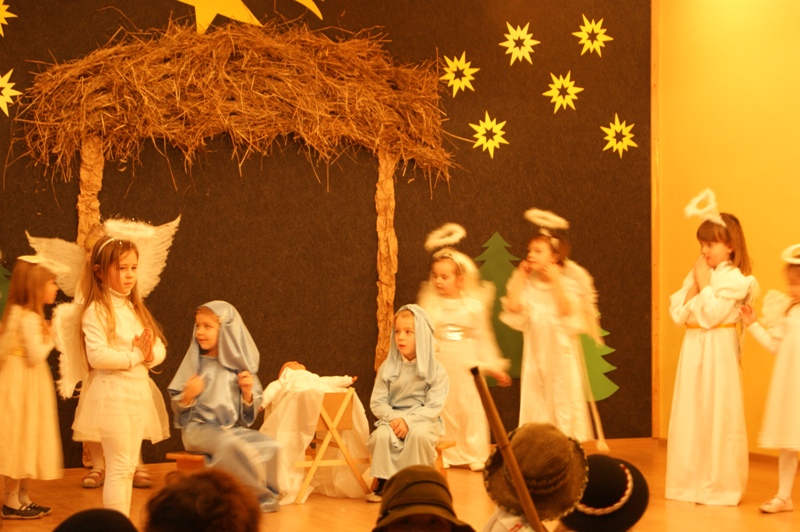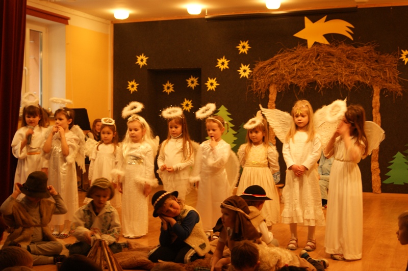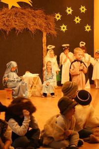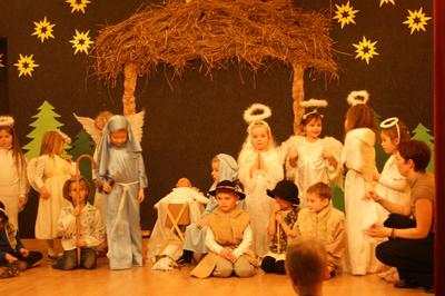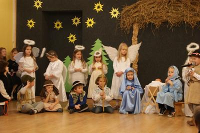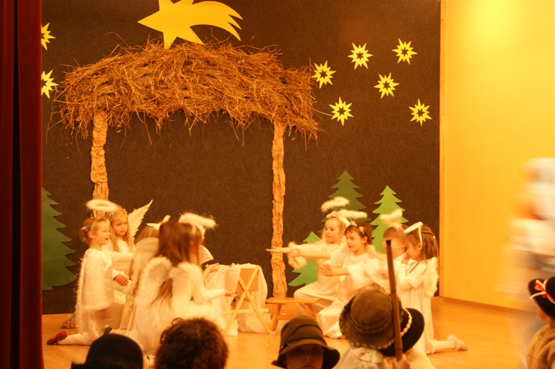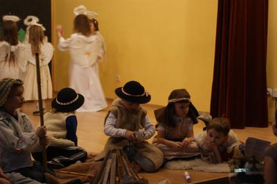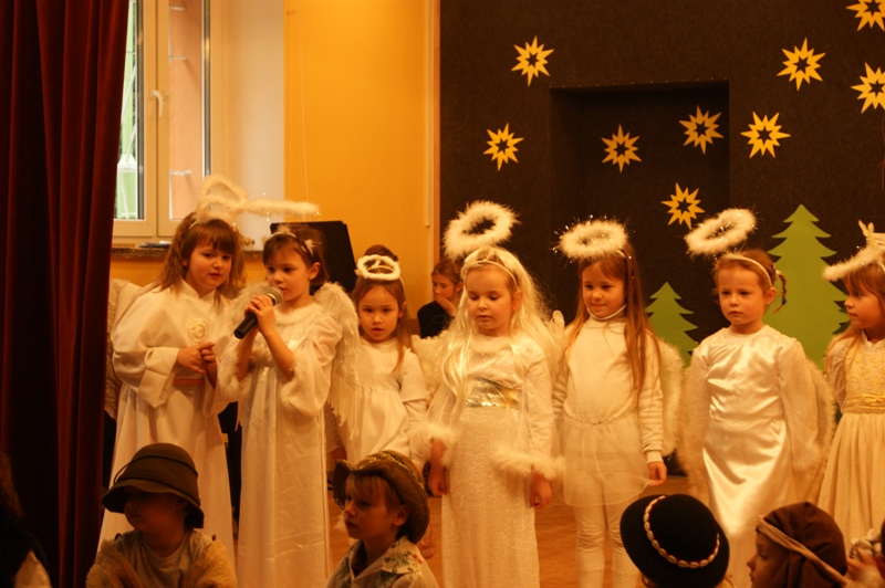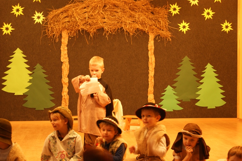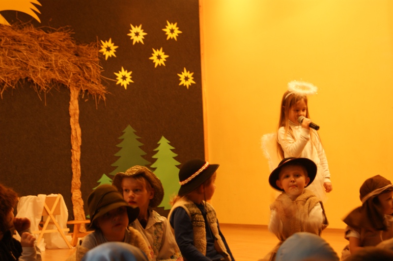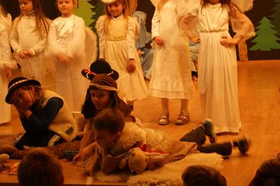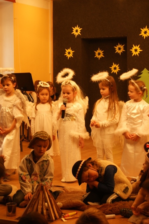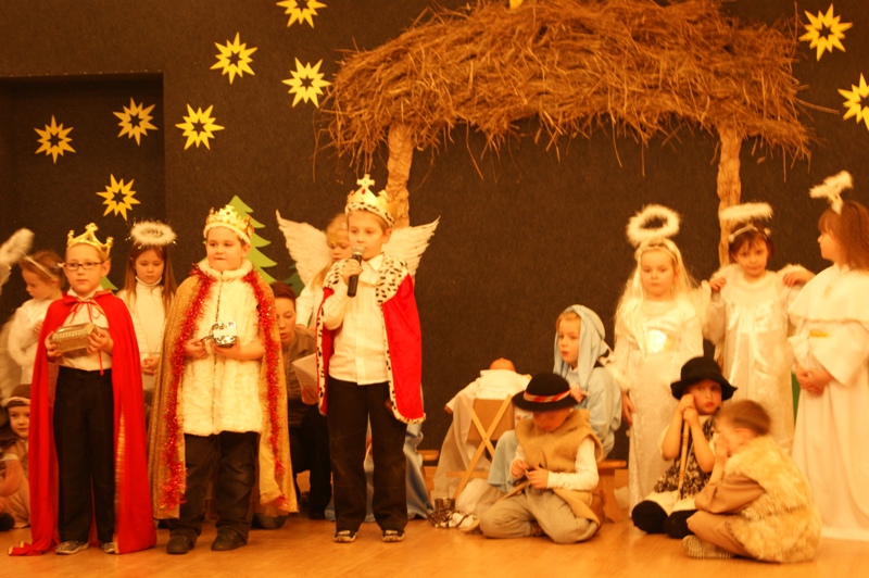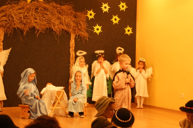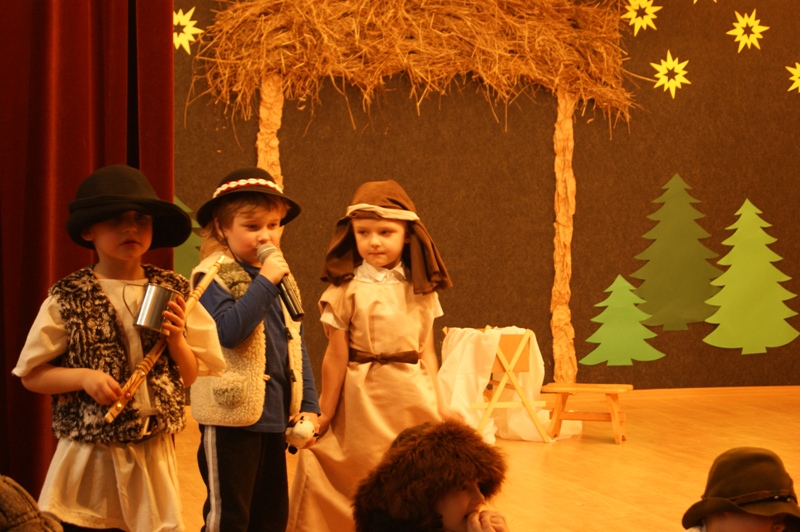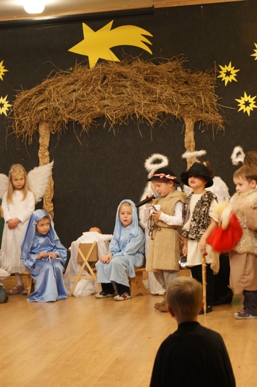 Najmłodsi, czyli dzieci z oddziału przedszkolnego, stanęli w tym dniu, po raz pierwszy, na scenie przed całą społecznością szkolną, aby przedstawić jasełka. Rodzice zorganizowali dzieciom przepiękne stroje i pomogli nauczyć się roli, licealiści przygotowali scenerię i oprawę muzyczną, a mali aktorzy byli BARDZO DZIELNI !!! i otrzymali zasłużone, wspaniałe brawa.