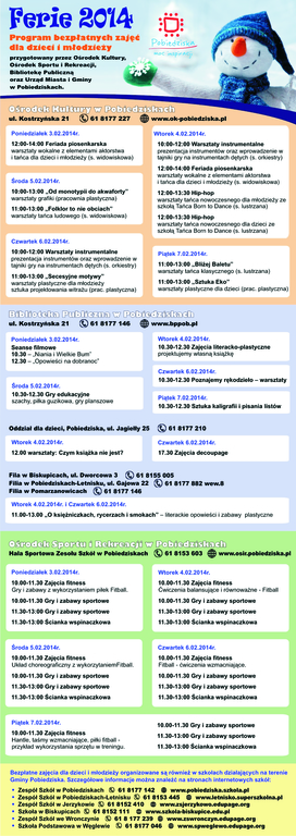 GMINNE FERIE ZIMOWE Zdjęcia Załączniki ferie2014.pdf [1.41 MB] Zobacz również Ciekawe lekcje poza murami szkoły Po indeks z Pitagorasem PLAN FERII ZIMOWYCH W ZESPOLE SZKÓŁ IM. KONSTYTUCJI... GMINNE FERIE ZIMOWE Świetlicowa zabawa karnawałowa NA BALE W KARNAWALE! 27 stycznia 2014 Aktualności Wydrukuj Udostępnij Wyświetlono: 622