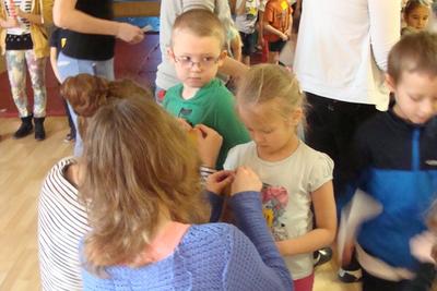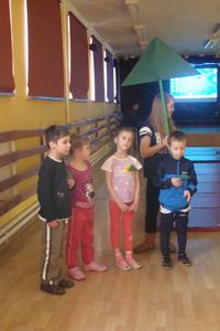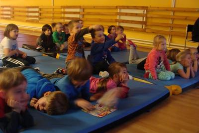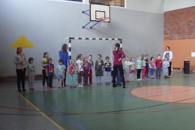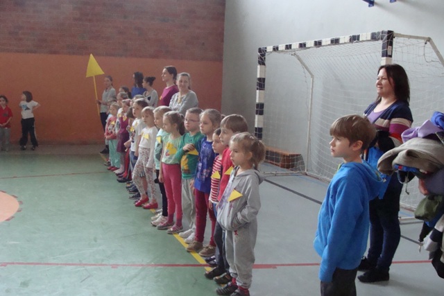 Po wspólnym obejrzeniu kilku bajek w " Kinie Przedszkolaka" i oficjalnym rozpoczęciu Przedszkoliady przez Panią Dyrektor Danutę Larus, wszyscy uczestnicy z olbrzymią radością przystąpili do rozgrzewki przy muzyce. Potem mali sportowcy zmierzyli się w różnych biegach połączonych z zadaniami ruchowymi. Wszystkim 63 uczestnikom wyścigów udało się zawody ukończyć i dlatego na zakończenie każdy został nagrodzony pamiątkowym dyplomem.