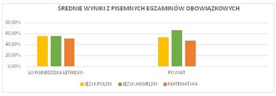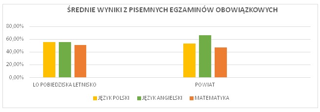 Uzyskane wyniki z pisemnych egzaminów obowiązkowych, tj. języka polskiego, języka angielskiego i matematyki są zadowalające, a nawet wyższe od średnich w innych liceach naszego powiatu.
