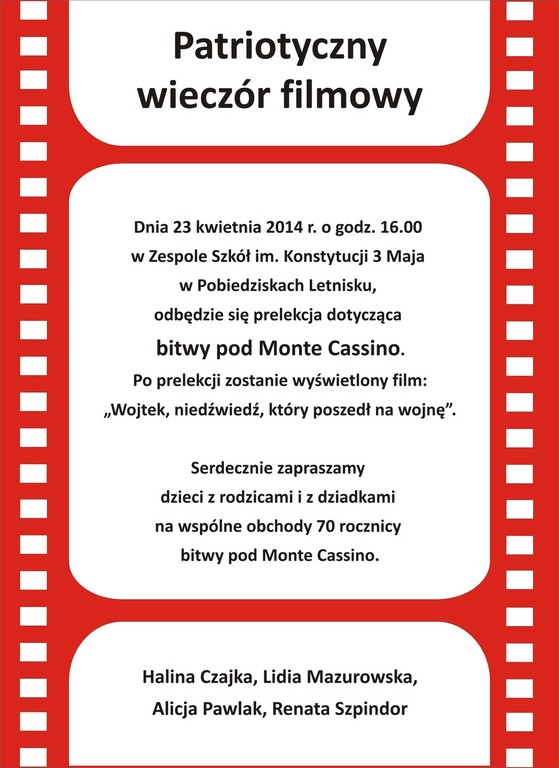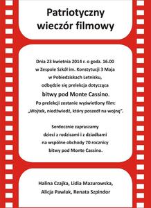 Patriotyczny wieczór filmowy Zdjęcia Zobacz również WIELKI SUKCES RECYTATORÓW Z EDUKACJI WCZESNOSZKOLNEJ PIOTR SZYMIEC DRUGI W POWIECIE IV Regionalny Dziecięcy Przegląd Pieśni Ludowej... Patriotyczny wieczór filmowy Spotkanie z przedstawicielami reprezentacji Włoch–... Karol Wojtyła Polski Święty 15 kwietnia 2014 Aktualności Wydrukuj Udostępnij Wyświetlono: 556