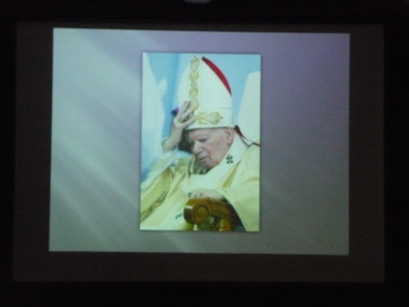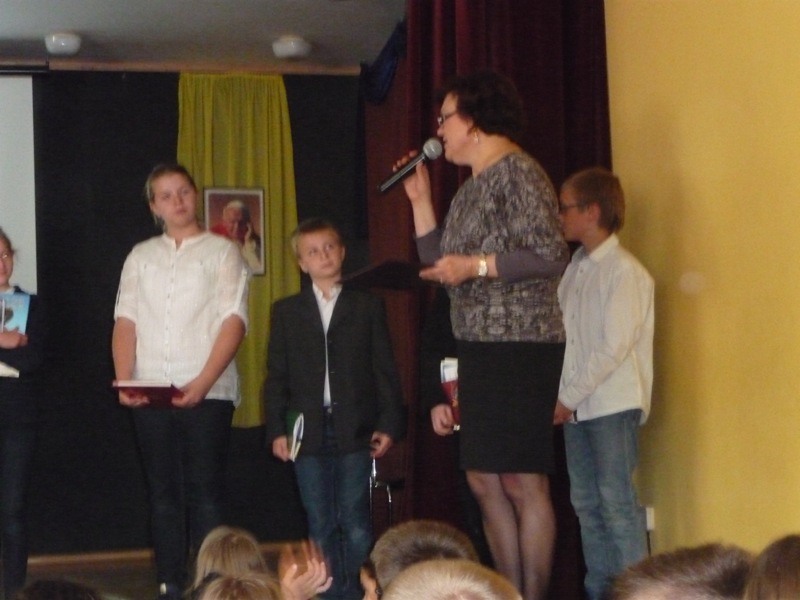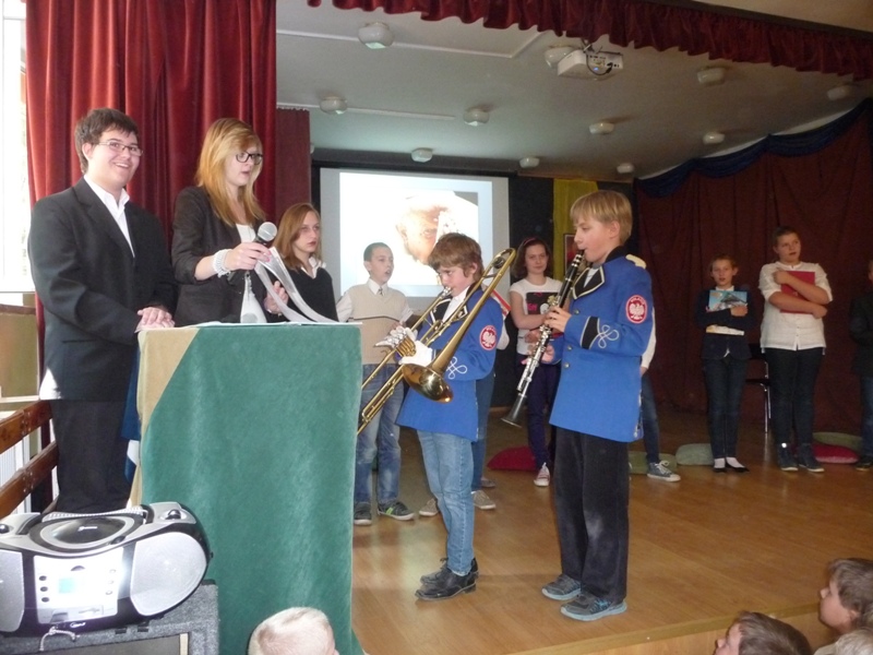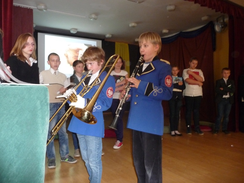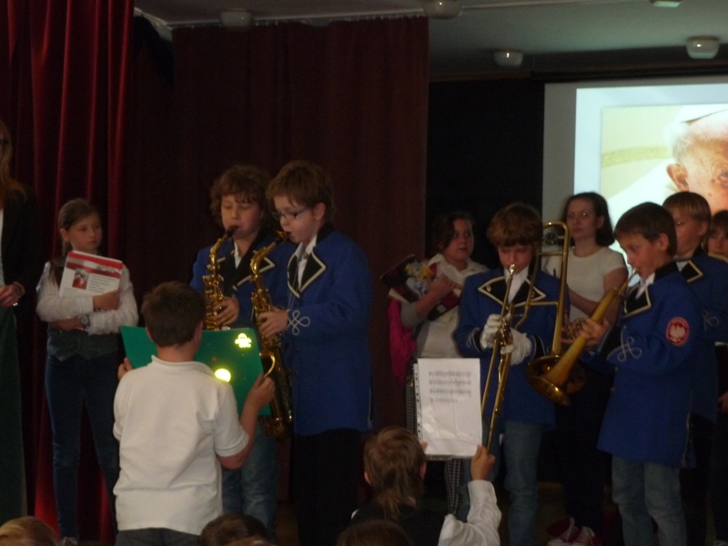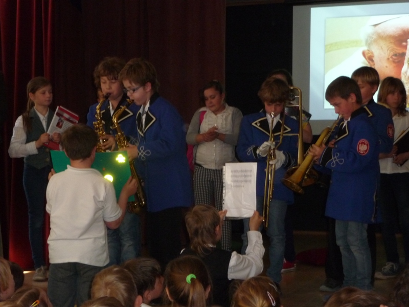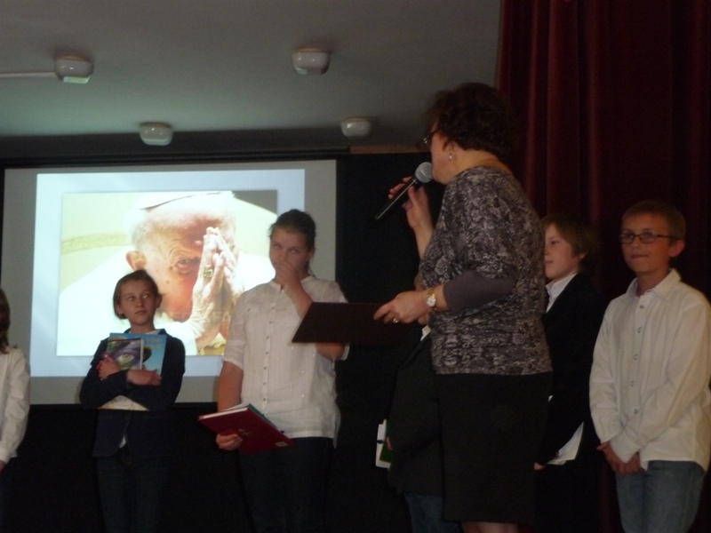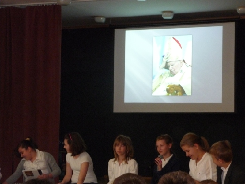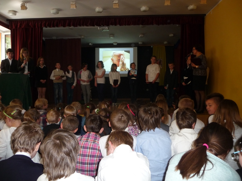Dnia 30 kwietnia w naszej szkole odbyła się uroczystość z okazji kanonizacji Jana Pawła II. Uczniowie z klasy V, pod kierunkiem pani Agnieszki Olejniczak, ukazali nam drogę papieża- Jana Pawła II- do świętości. Papież kochał i szanował wszystkich ludzi. Każdy człowiek był dla niego jedyny i niepowtarzalny. Wzywał ludzi do działania i sprzeciwiania się złu. „Nie lękajcie się”- te słowa dały ludziom nadzieję na lepsze życie w Polsce. Z przesłaniem pokoju i Bożej miłości papież podróżował po całym świecie. Niósł Boga rodzinom, dzieciom, młodzieży, biednym i bezdomnym. Miał serce otwarte na wszystkie problemy i cierpienia. Dziękujemy za wspomnienie Wielkiego Rodaka Papieża Jana Pawła II.