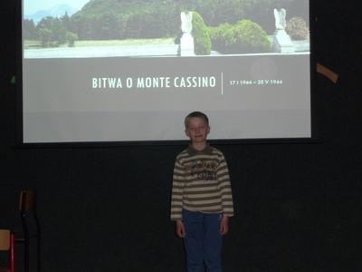 Dnia 23 kwietnia w naszej szkole odbył się patriotyczny wieczór filmowy. Uczniowie i nauczyciele obejrzeli razem prezentację dotyczącą bitwy pod Monte Cassino, a później film: „Wojtek, niedźwiedź, który poszedł na wojnę”. Wzruszyła nas historia niedźwiedzia- Wojtka, który z żołnierzami polskimi walczył z Niemcami. Kiedy wojna została wygrana, musiał pozostać w obcym kraju, bo nie mógł, podobnie jak wielu Polaków, wrócić do Polski.