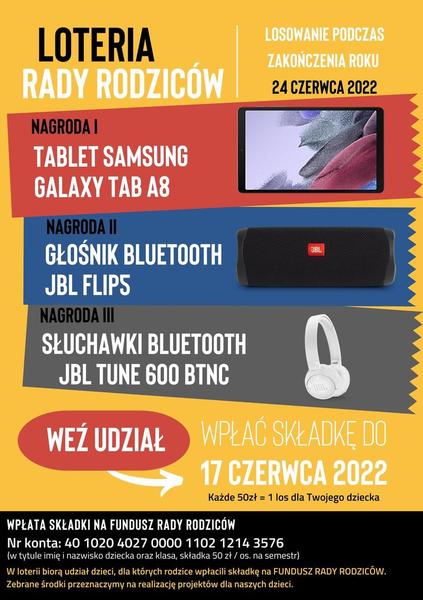 06 czerwca 2022 Aktualności Loteria Rady Rodziców Rada Rodziców zaprasza do wzięcia udziału w loterii, gdzie zostaną rozlosowane 3 wartościowe nagrody (tablet, głośnik i słuchawki bezprzewodowe).Uczestnikami loterii są wszystkie dzieci, dla których... Czytaj więcej